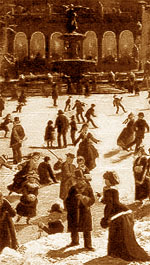 Perhaps John O'Brien Inman's best known canvass, part of the Museum of the City of New York collection, is an 1878 vivid multi color oil painting entitled “Moonlight Skating Central Park, the Lake and Terrace “ (sepia detail left).
