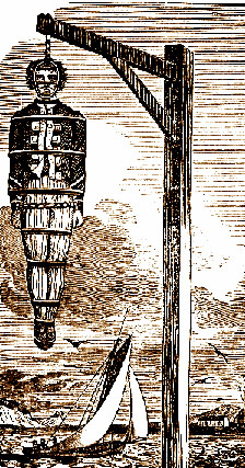 Kidd was hanged May 23rd, 1701, on Execution Dock at Tilbury Point. After dead, his body reportedly was harnessed with iron hoops (left) and remained hanging as a warning to all would-be pirates.