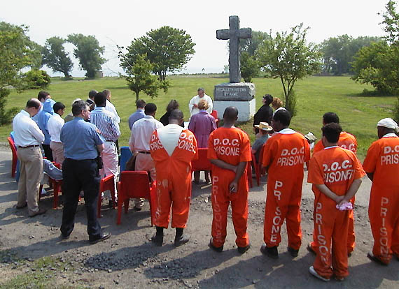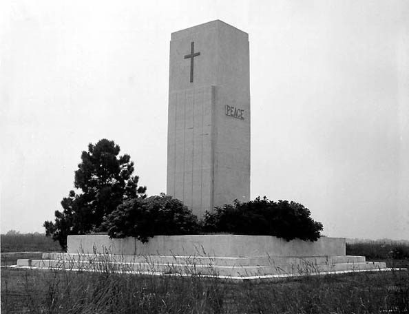 A service in memory of all dead on Hart -- estimated at 750,000 in 130 years -- is conducted annually by a volunteer group, as shown above. Inmates may participate. Persons who establish a family member has been buried on Hart may arrange a visit for grief closure. In 1948 on the island's only hill, inmates initiated and completed building, with staff supervision, a monument to the island's dead. The word "Peace" appears on one side as shown below. Ironically just across the road from it, the Army installed and maintained a Niki Ajax missle defense base early during the Cold War. | |