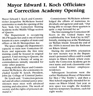 at Correction Academy Opening Mayor Edward 1. Koch and Commissioner Jacqueline McMickens hosted ceremonies to mark the opening of the New York City Correction Training Academy in the Middle Village section of Queens.