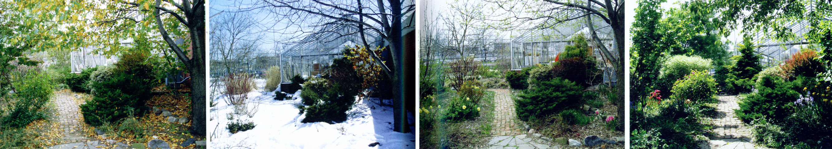 ![]() 4 Seasons in Rikers Island Garden - (from left) fall, winter, spring and summer on greenhouse pathway. |