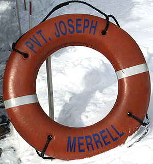 Above left, courtesy of NYC ferries historian Jeffrey D. Cavorley, is a photo of the Pvt. Merrell in drydock in 1984 before it became the Harold A. Wildstein. Above right is his photo of a Merrell lifering found floating in Kill Van Kull after the incompletely scrapped ex-Harold A. Wildstein sunk at the Bayonne demolition dock.