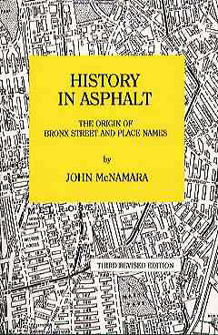 It was while portaging a canoe over the small neck of land connecting Fort Schuyler to the mainland that John was approached by Captain Charles Ferreira, the lighthouse keeper, who told him how the Indians did the same thing. This sparked his interest in the Indian history of the Bronx and when street signs began going up in the early 1920s, his curiosity was further piqued. He began studying street names and eventually walked every street and byway in the borough and canoed or kayaked every waterway. He kept meticulous notes and in 1978 published his grand collection in a book entitled History in Asphalt. Most historians now consider that book as the most important contemporary work published on the Bronx. John became one of the founding fathers of the Bronx County Historical Society and in 1956 began writing Bronx history in the Bronx Press-Review, and later in the The Bronx Times Reporter. He published a collection of his columns in a book entitled McNamara's Old Bronx.